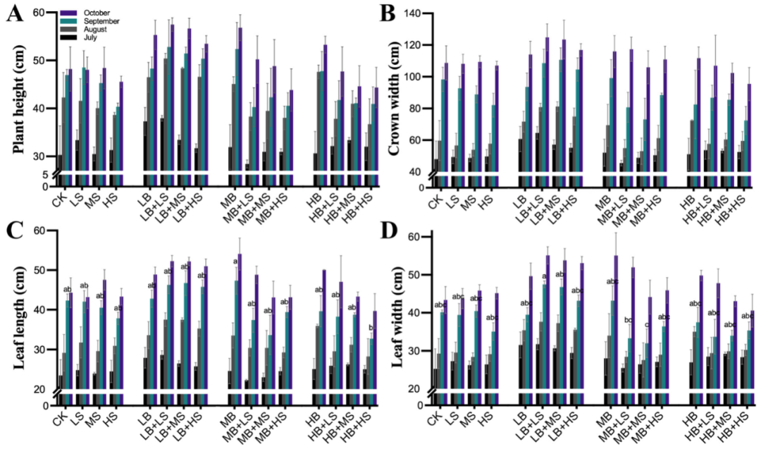 R. palmatum?L.在不同生長時(shí)期(7、8、9、10月)的生長參數(shù)如圖1所示。與對照組(CK)相比,任意三種濃度的細(xì)菌接種劑(LB、MB和HB)處理后的株高、冠寬、葉長和葉寬都有所增加。我們的結(jié)果顯示了兩個(gè)明顯的倒V形趨勢,在四種含 LB 的處理(LB、LB + LS、LB + MS和LB + HS)中出現(xiàn)了一個(gè)外峰。盡管HB處理增加了R. palmatum?L.的生長,但當(dāng)與蔗糖結(jié)合時(shí),它降低了生長,尤其是在 HB + HS 處理下。這表明用高水平蔗糖(15 g/L)修正的高水平細(xì)菌接種劑(1.0 ×?107CFU/mL)抑制了PGPM的植物促生長功能。