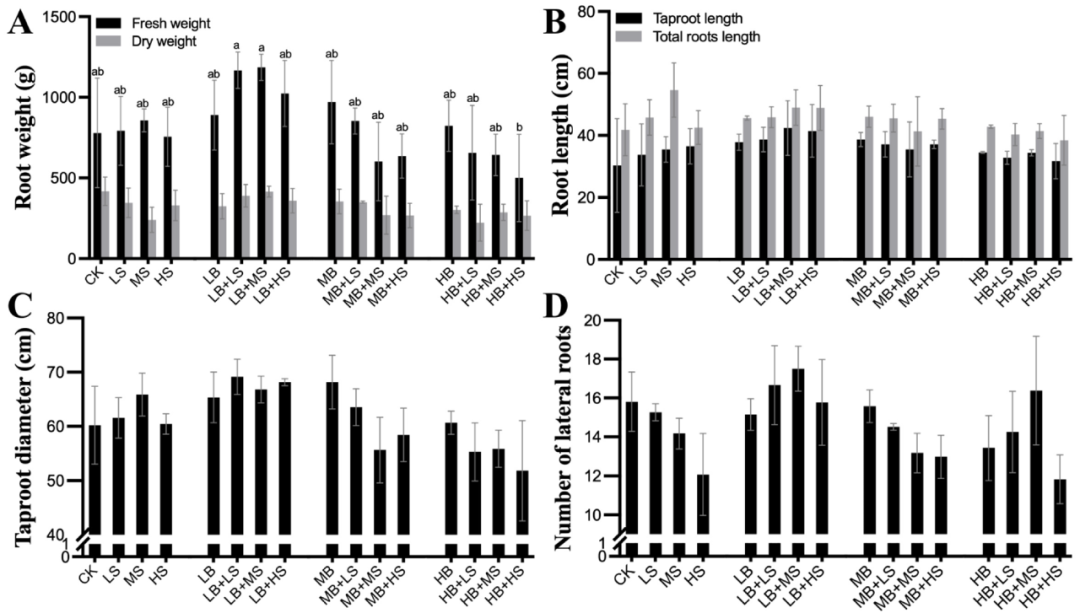 在收獲時(shí),還確定了地塊產(chǎn)量的變化(圖2)。與兩個(gè)明顯的倒V形趨勢的生長結(jié)果一致,LB + LS和LB + MS處理下的R. palmatum?L.根的鮮重得到了最顯著的改善(圖2A)。我們進(jìn)一步分析了主根和側(cè)根的變化(圖2B-D),發(fā)現(xiàn)在LB+MS下獲得最大的根長和側(cè)根數(shù),而在LB+LS下獲得最大的主根直徑,這意味著 LB + MS處理刺激側(cè)根的數(shù)量和長度,而LB + LS促進(jìn)主根厚度以提高R. palmatum?L.的根重。