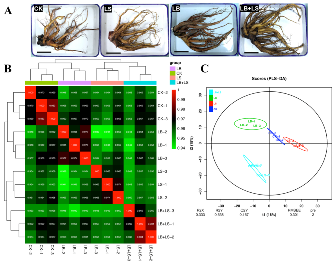 重點(diǎn)放在LB+LS的結(jié)合分組,通過廣靶代謝組學(xué)探索促進(jìn)植物生長的潛在機(jī)制(圖3A)。共對12個(gè)新鮮的根樣品進(jìn)行了表征,鑒定了800種帶注釋的代謝物,主要由38種羧酸及其衍生物、15種有機(jī)氧化合物、14種脂肪?;?11種有機(jī)氮化合物組成。使用 GC-TOF-MS的全局靶向代謝組分析方法進(jìn)行相關(guān)偏最小二乘判別分析 (PLS-DA),如圖所示(圖3B),三個(gè)生物配對之間的 Spearman相關(guān)系數(shù)均超過0.94,這表現(xiàn)了實(shí)驗(yàn)的高重現(xiàn)性。然后通過PLS-DA評分圖來評估這些植物組織樣品之間的差異(圖3C),結(jié)果顯示出了分組之間的明顯分離。此外,對潛在結(jié)構(gòu)判別分析(OPLS-DA)建模的監(jiān)督正交投影也揭示了這些分組植物組織樣本代謝組比較中的顯著差異。
