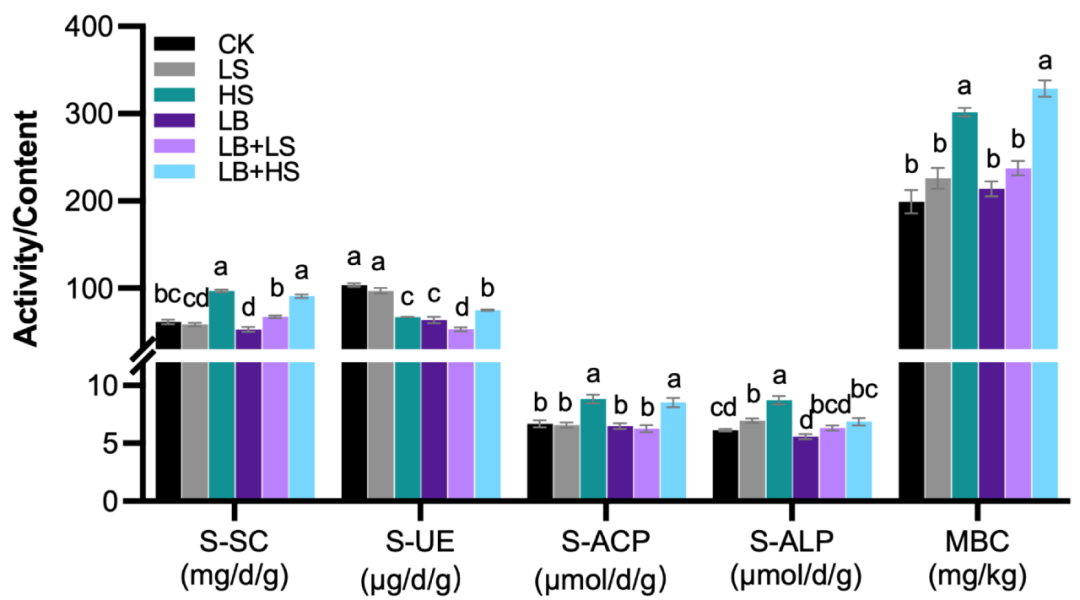 然而,與根際土壤相比,大塊土壤中的硝酸鹽氮(NO3-N)異常高(33.19 ± 2.98 mg/kg),這表明根際微生物對氮的利用率很高。此外,HS根際土壤中有效磷和總磷的量顯著增加,這表明在沒有任何PGPM的情況下添加高蔗糖可能提供了磷轉(zhuǎn)化所需的碳。LB + LS處理顯著增加了總鉀并降低了速效鉀,這表明根際土壤中鉀的利用率有所提高。普遍增加的碳和營養(yǎng)物質(zhì)的可用性也將刺激微生物活動(dòng),而酶活性水平的提高證實(shí)了這一點(diǎn)(圖5)。