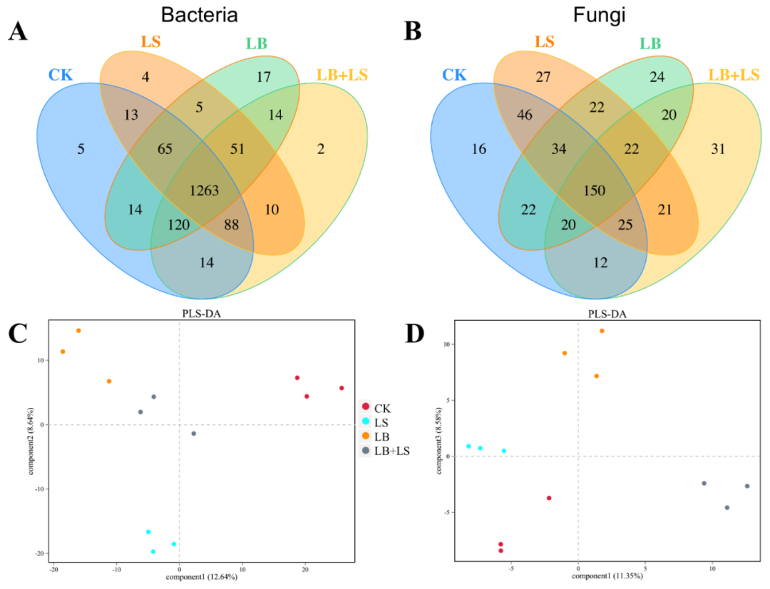 生成了基于16S rRNA 基因的細(xì)菌測序和基于ITS rRNA 基因的真菌測序圖譜,以更好地揭示大黃根際的微生物群落組成。使用 97%的核苷酸序列同一性,將這些序列分為1685個(gè)細(xì)菌OTU和492個(gè)真菌OTU,其中CK根際細(xì)菌OTU豐度最高(1582),其次是LB + LS(1562)、LB(1549)、和LS (1499)處理,而LS根際的真菌OTU數(shù)量(347)最高,其次是CK (325)、LB (314) 和LB + LS (301) 處理(圖6A,B)。維恩圖表明CK、LS、LB和LB + LS處理分別有5、4、17 和 2 個(gè)共享的OTU,在細(xì)菌群落中共有1263個(gè)OTU。在真菌群落中,CK、LS、LB和LB + LS處理分別有16、27、24和31個(gè)OTU,共享了150個(gè)OTU(圖6A,B)。