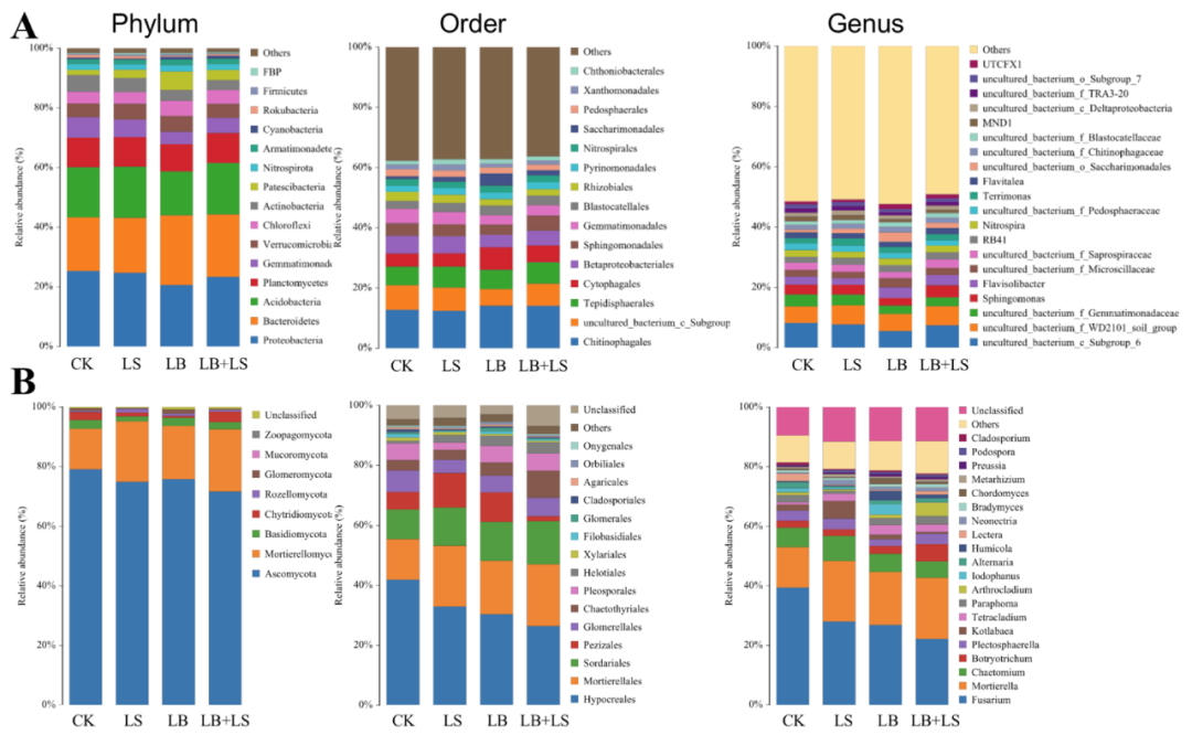 進(jìn)一步分析微生物群落結(jié)構(gòu)表明,16S rRNA基因序列隸屬于31門257科396屬,而ITS rRNA基因序列隸屬于8門100科170屬。圖7顯示了在群落組成中發(fā)現(xiàn)的15個(gè)最豐富的門和目,以及前20個(gè)屬。Proteobacteria,Bacteroidetes,AcidobacteriaPlanctomycetes是所有樣品中最主要的四種細(xì)菌門(圖7A),占所有分類細(xì)菌序列相對豐度的67.8-71.68%。Proteobacteria是CK、LS和LB +LS 土壤中的主要細(xì)菌門,而Bacteroidetes?(23.4%) 是LB處理土壤中最高的門,其次是Proteobacteria?(20.6%)。這表明PGPM修正后的土壤細(xì)菌群落與蔗糖處理 (LS) 或 CK 后的土壤細(xì)菌群落顯著不同。此外,LB和LB + LS處理的樣品中Cyanobacteria的相對豐度增加,而CK和LS樣品中的Rokubacteria增加。