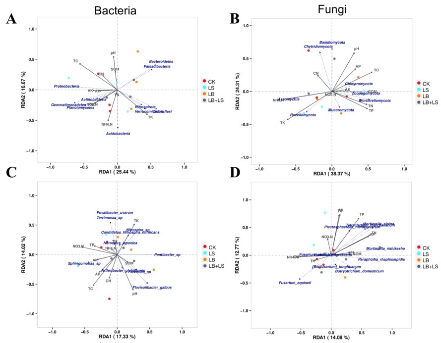 對于門水平的真菌,總?cè)郝浣M成與以下土壤理化性質(zhì)密切相關(guān):TK、NH4-N、TC、pH和TP(圖8B)。LS土壤以RozellomycotaMortierellomycota為主,其成員與TK和TP相關(guān)性最高,LB處理的土壤以Mortierellomycota、ZoopagomycotaMucoromycota為主,與 TP、TN和SOM相關(guān)性最高,以及LB + LS土壤以BasidiomycotaChytridiomycota為主,它們與土壤pH和C/N有關(guān)。