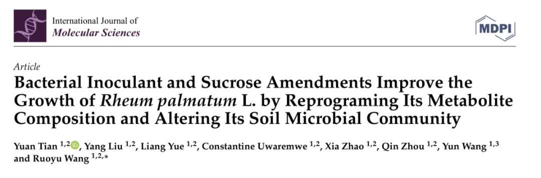 Tian Y, Liu Y, Yue L, et al. Bacterial Inoculant and Sucrose Amendments Improve the Growth of Rheum palmatum L. by Reprograming Its Metabolite Composition and Altering Its Soil Microbial Community[J]. International Journal of Molecular Sciences, 2022, 23(3): 1694.