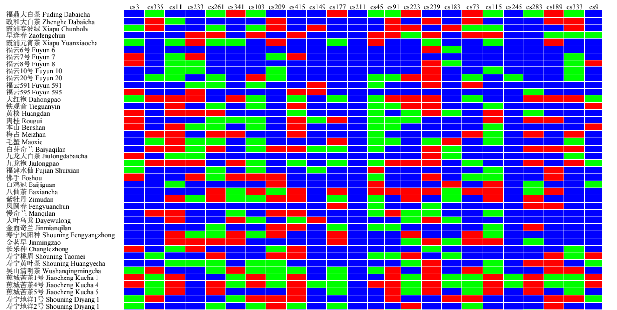 篩選適宜的核心標(biāo)記位點(diǎn),并將其用合適的形式展現(xiàn)出來至關(guān)重要。利用篩選得到的SNP標(biāo)記進(jìn)行品種材料的鑒定,并構(gòu)建DNA指紋圖譜。例如,玉米DNA指紋圖譜構(gòu)建研究中,利用384個(gè)?SNP?標(biāo)記組合構(gòu)建了?335?個(gè)玉米雜交種的基因型指紋圖譜,?該圖顯示每個(gè)品種的基因型組合均不同,?即?384?個(gè)?SNP?位點(diǎn)能夠有效區(qū)分所測試的雜交種。