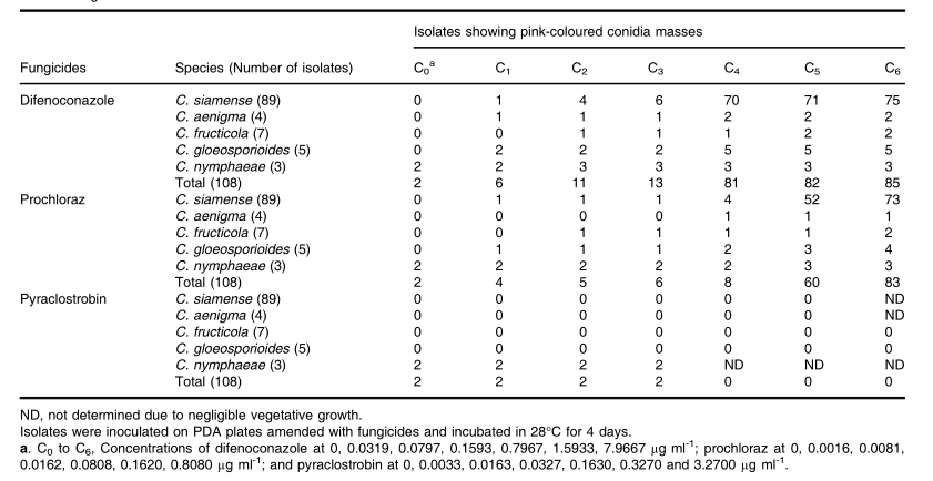 五種炭疽菌在含有不同濃度苯醚甲環(huán)唑的PDA上的形態(tài)特征