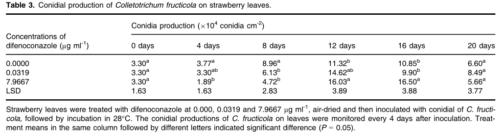 2.苯醚甲環(huán)唑對炭疽菌在草莓葉片上產孢的影響