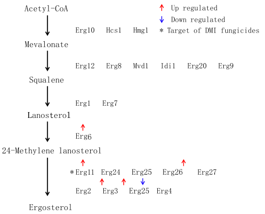 在真菌中,麥角甾醇是由乙酰輔酶A(乙酰輔酶A)通過復雜途徑合成的。釀酒酵母中的麥角甾醇生物合成步驟研究較為透徹,共有21個基因參與麥角甾醇生物合成。我們從C. fructicola中找到了相關同源基因。在苯醚甲環(huán)唑脅迫下,在參與麥角甾醇生物合成的基因中,與對照相比, Erg11(DMI殺菌劑的靶標,在真菌中被稱為CYP51)基因被發(fā)現上調。Erg6、Erg27、Erg3和Erg5基因表達量也上調。與對照組相比,Erg4基因受到抑制。苯醚甲環(huán)唑處理后,其他15個基因的表達水平沒有顯著變化。說明:DMI類殺菌劑對炭疽菌產孢的促進作用可能與麥角甾醇合成途徑中基因表達量的變化及甾醇種類變化有關。