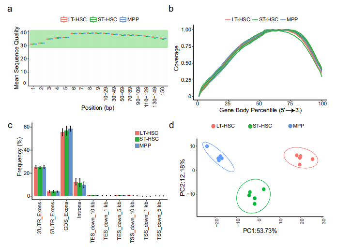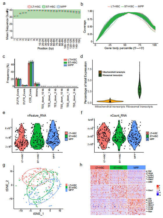 對(duì)于批量RNA測(cè)序,PCA分析顯示三種細(xì)胞類型在PC1軸上分離,PC1的變異率為53.73%(圖3d)。與單細(xì)胞數(shù)據(jù)相似,ST-HSC位于LT-HSC和MPP之間,與它們的生物學(xué)狀態(tài)相對(duì)應(yīng)。綜上所述,這些結(jié)果表明細(xì)胞被正確分選,批量和單細(xì)胞短讀長(zhǎng)RNA-seq數(shù)據(jù)的質(zhì)量都很高。