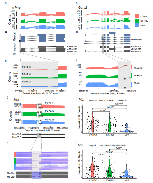 為了進(jìn)一步確認(rèn)長(zhǎng)讀長(zhǎng)在識(shí)別可變剪接異構(gòu)體方面的優(yōu)勢(shì),使用納米孔和PacBio測(cè)序數(shù)據(jù)對(duì)三種細(xì)胞類型中已知的LT-HSC的標(biāo)志物c-Myc和Gata2(圖2h)的轉(zhuǎn)錄本進(jìn)行了可視化。接下來(lái)篩選了所有映射到基因c-Myc和Gata2及其注釋的轉(zhuǎn)錄本上的reads。發(fā)現(xiàn)2915個(gè)reads覆蓋到了c-Myc,且LT-HSC的reads數(shù)*多(圖6a)。在納米孔和PacBio測(cè)序數(shù)據(jù)中可視化了全長(zhǎng)轉(zhuǎn)錄本的reads,發(fā)現(xiàn)所有注釋的亞型都能被鑒定識(shí)別(圖6c)。在c-Myc第一個(gè)外顯子中發(fā)現(xiàn)了一個(gè)5 ‘的可變剪接起始位點(diǎn)。使用短讀長(zhǎng)測(cè)序數(shù)據(jù)來(lái)定量該基因座的剪接百分比(PSI),發(fā)現(xiàn)較長(zhǎng)的異構(gòu)體在所有三種細(xì)胞類型中具有相似的 PSI(剪接百分比),ST-HSC中包含第一個(gè)外顯子的較長(zhǎng)異構(gòu)體的reads占比比較高(圖6 e)。對(duì)于Gata2來(lái)說(shuō),發(fā)現(xiàn)覆蓋有595個(gè)reads,在LT-HSC中比其他兩種細(xì)胞類型多了近20倍的reads數(shù)(圖6b)。通過(guò)對(duì)比全長(zhǎng)reads和注釋的轉(zhuǎn)錄本,發(fā)現(xiàn)在LT-HSC中Ensembl的轉(zhuǎn)錄本中有一個(gè)未注釋的內(nèi)含子保留(圖6d)。隨后利用短讀長(zhǎng)測(cè)序數(shù)據(jù)驗(yàn)證驗(yàn)證了這種內(nèi)含子保留并定量這個(gè)內(nèi)含子的PSI值,發(fā)現(xiàn)該內(nèi)含子在LT-HSC中PSI值*高(圖6f)。接下來(lái)展示將長(zhǎng)讀長(zhǎng)測(cè)序與單細(xì)胞RNA-seq結(jié)合的數(shù)據(jù)示例,從長(zhǎng)讀長(zhǎng)測(cè)序數(shù)據(jù)中鑒定到了一個(gè)在Mpl中具有24 bp可變剪接區(qū)域的可5’剪接位點(diǎn)(A5)?;赟mart-seq2的測(cè)序數(shù)據(jù)發(fā)現(xiàn)這個(gè)剪接事件在不同細(xì)胞類型中是差異的,其PSI值從LT-HSC,ST-HSC到MPP是依次遞減的(圖6g-j)。使用Smart-seq2數(shù)據(jù)可以觀察到單個(gè)細(xì)胞間的異質(zhì)性(圖6h),在造血過(guò)程中,所涉及的長(zhǎng)和短剪接位點(diǎn)(SJ)是被顯著下調(diào)的(圖6i,j)。這些結(jié)果表明,整合短讀長(zhǎng)和長(zhǎng)讀長(zhǎng)測(cè)序有助于識(shí)別差異表達(dá)的異構(gòu)體。