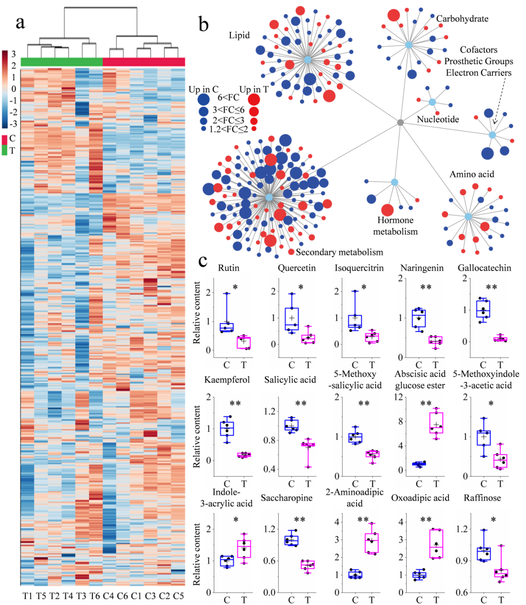 圖2四環(huán)素改變了代謝組,特別是次生代謝和脂質(zhì)代謝。a、代謝物的熱圖譜聚類,顯示代謝物的相對含量。b、差異代謝物根據(jù)其功能/通路的綜合性進(jìn)行聚類。?圓的大小與折疊變化(FC)值成正比。?紅色表示在四環(huán)素中有更高的FC?(T),而藍(lán)色表示在對照中有更高的FC?(C)。c、受四環(huán)素影響的代謝途徑相關(guān)代謝物的箱式圖。?*在P?<?0.05時差異顯著,**在P?<?0.01時差異顯著。