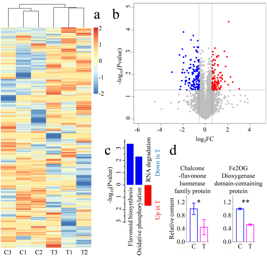 與對照組相比,在四環(huán)素處理下有273種蛋白質(zhì)發(fā)生了顯著變化(P<?0.05)。KEGG富集分析發(fā)現(xiàn),這些差異蛋白與類黃酮生物合成、氧化磷酸化、RNA降解、植物晝夜節(jié)律和α?-亞麻酸代謝相關(guān)。最顯著的是,在四環(huán)素脅迫下,與RNA降解相關(guān)的蛋白顯著增加(P?<?0.05,增加80%以上)。黃酮類化合物的生物合成和氧化磷酸化顯著減少(P?<?0.05,下降80%以上)。與轉(zhuǎn)錄組結(jié)果一致,黃酮類化合物的生物合成通路也是顯著降低。