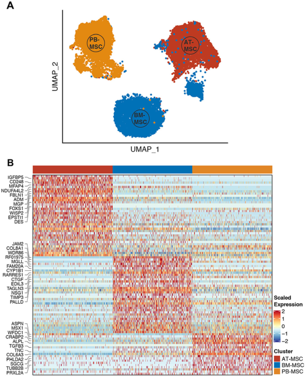 美國康奈爾大學(xué)獸醫(yī)學(xué)院貝克動物健康研究所Van?de?Walle研究團(tuán)隊(duì)于2020年12月4日在Stem?Cell?Research?&?Therapy上發(fā)表了解析MSC異質(zhì)性的研究進(jìn)展。文章利用了scRNA-seq等技術(shù)探索三個(gè)不同組織來源(AT、BM、PB)的原代馬間充質(zhì)基質(zhì)細(xì)胞的源間和源內(nèi)異質(zhì)性,并確定了檢測到的轉(zhuǎn)錄差異與細(xì)胞運(yùn)動和免疫調(diào)節(jié)功能的表型變異相對應(yīng),這將提高M(jìn)SC?治療潛力,加速其從實(shí)驗(yàn)室到臨床的過渡。
