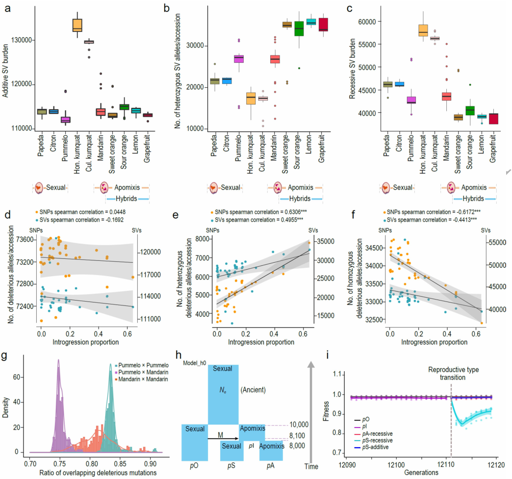 柑橘通過珠心進(jìn)行無融合生殖,保留了母體基因型,這可能導(dǎo)致基因組中有害突變和結(jié)構(gòu)變異(SVs)的積累。從234份材料中共鑒定出139,241個(gè)可靠的SVs,其中64.2%為缺失,16.6%為重復(fù),15.5%為易位。山金柑的SV數(shù)量最高,可能與有效種群大小減少有關(guān)(圖3a)。具有無融合生殖的雜交群體的雜合有害變異約為有性生殖群體的1.45倍。隨后提出了雜種無融合生殖將SVs隱藏在雜合子狀態(tài)的假說,這可能主要是隱性選擇造成的危害。因此,有性生殖的雜種可能會迅速以隱性純合的方式暴露有害變異。這個(gè)假說解釋了為什么無融合生殖和有性生殖的天然雜交樣本中觀察到的自然雜種通常是無融合生殖的。有害突變的模式與SVs的模式一致,即與有性生殖群體相比,無融合生殖群體的隱性有害負(fù)擔(dān)較低(7.39%),雜合子SVs較多(約2.62倍)。在隱性模型下,從無融合生殖到有性生殖的生殖模式轉(zhuǎn)變導(dǎo)致種群適應(yīng)度在轉(zhuǎn)變后立即下降13.48±0.87%,但隨后恢復(fù)(圖3i)。相比之下,保持無融合生殖的種群保持種群適合度。