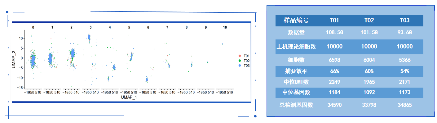 PBMC重復性檢測:將相同的PBMC細胞懸液分3份,通過3個不同實驗人員,用3臺百創(chuàng)DG1000儀器,獨立進行單細胞測序,得到了幾乎一致的細胞聚類分群結果,證明百創(chuàng)DG1000具有很好的可重復性及穩(wěn)定性(圖5)。