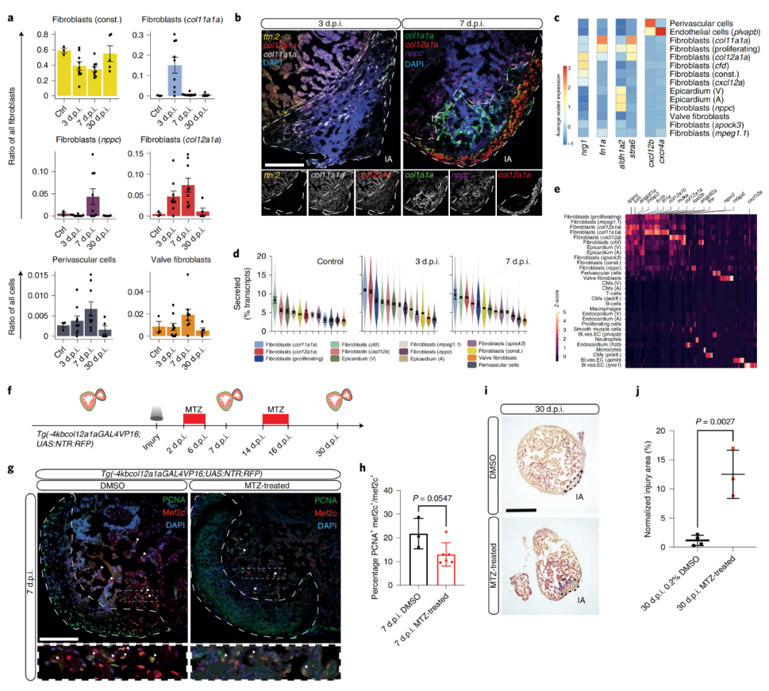 雖然作者對單細胞基因表達譜的時空分析強烈表明了瞬時成纖維細胞的再生功能,但還需要額外的實驗來驗證這一假設。為了從功能上評估瞬時col11a1a和col12a1a成纖維細胞的作用,作者使用硝基還原酶/甲硝唑(NTR/MTZ)系統(tǒng)進行靶向細胞剔除。在MTZ處理后的轉基因系Tg(-4kbcol12a1a:GAL4VP16;UAS:NTR:RFP)中,在7 d.p.i.時相較于對照,5 / 6的心臟顯示心肌細胞增殖減少,col12aa表達細胞減少(圖3g,h)。在30d.p.i.時,col12a1+細胞剔除顯著損害心臟再生(圖3i,j)??傊?,作者確定了心臟再生過程中具有潛在再生作用的三種成纖維細胞狀態(tài):col11a1a、col12a1a和nppc成纖維細胞?;蚣毎蕹龜祿娏冶砻?em>col12a1a表達細胞在再生生態(tài)位中發(fā)揮了作用。