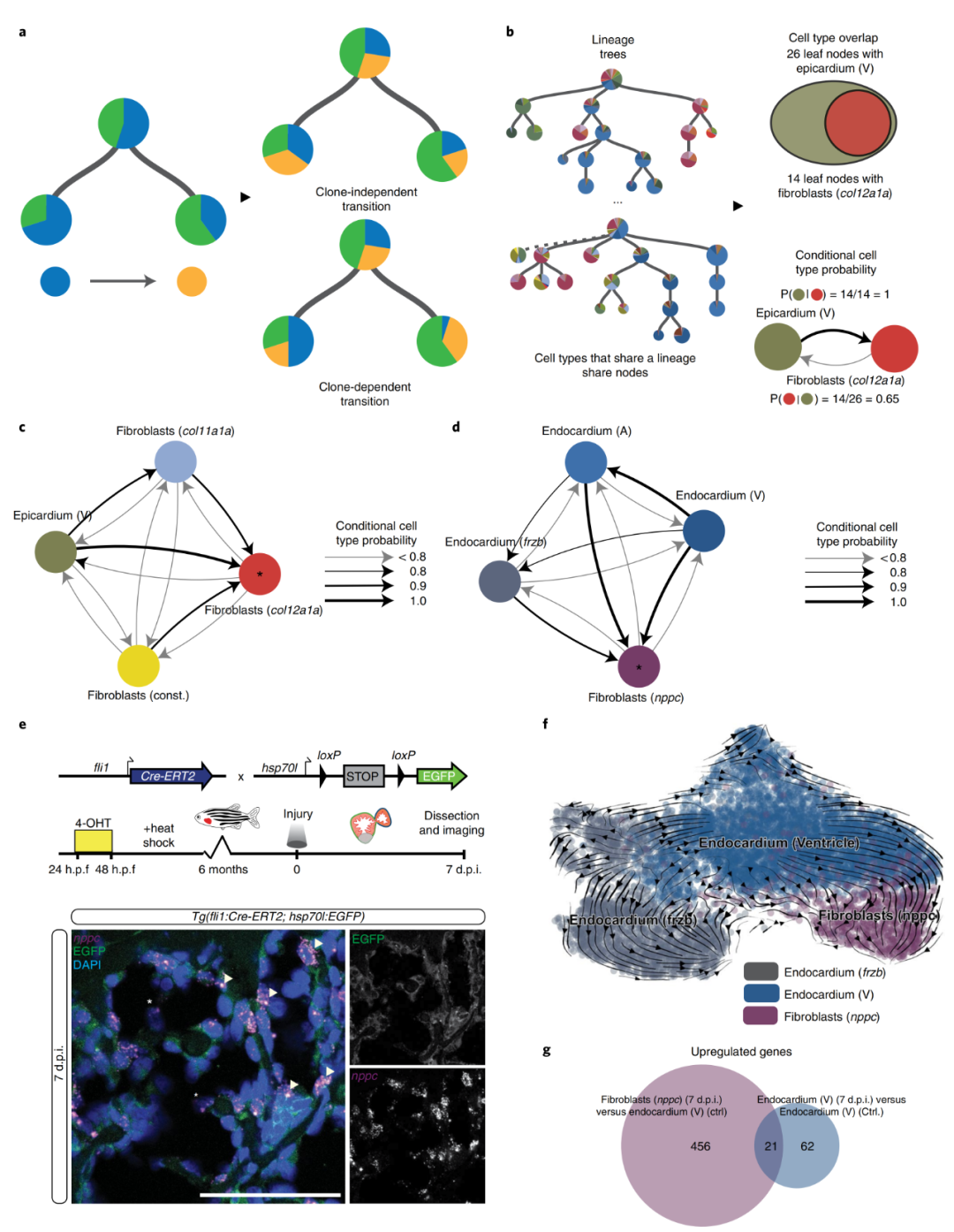 為了系統(tǒng)地識別健康和再生斑馬魚心臟中的細胞類型,作者對損傷前后不同階段的大約20萬個解離細胞進行了scRNA-seq(圖1a)。為了準確得到細胞發(fā)育起源的相關信息,作者還應用了一種基于CRISPR–Cas9技術的大規(guī)模平行譜系追蹤方法,通過注射Cas9和針對多拷貝轉基因(斑馬魚系中的dTomato:一種用于斑馬魚細胞追蹤和譜系分析的多光譜細胞標記)的sgRNA,創(chuàng)建了作為譜系條形碼的“遺傳疤痕”來記錄早期發(fā)育中的譜系關系。