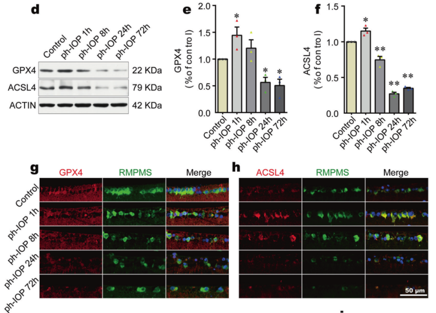 為了驗證PH-IOP損失引起的視網(wǎng)膜鐵積累可能導致視網(wǎng)膜鐵死亡這一假設(shè),測量了氧化應(yīng)激相關(guān)生化指標,發(fā)現(xiàn)Ph-IOP損傷早期階段MDA含量顯著增加,而GSH和NADPH水平顯著降低;進一步檢測鐵死亡核心標志物GPX4(抑鐵死亡因子)和ACSL4(促鐵死亡因子)發(fā)現(xiàn),ph-IOP 損傷后24h,GPX4水平降低,在PH-IOP損傷后1h,ACSL4水平上調(diào)(圖3d-f);并且這些鐵死亡相關(guān)蛋白的變化主要集中在視網(wǎng)膜內(nèi)層,尤其是神經(jīng)節(jié)層(圖3g, h),提示鐵死亡誘導的細胞損傷可能集中在 RGC 中(位于視網(wǎng)膜最內(nèi)層);TEM檢測發(fā)現(xiàn)PH-IOP引起RGC線粒體收縮和線粒體膜密度增加,表明ph-IOP誘導的視網(wǎng)膜鐵累積導致視網(wǎng)膜鐵死亡,特別是在 RGC中。