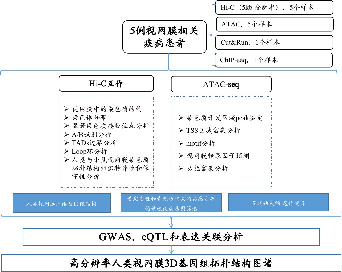 材料:一共取材5名患者捐贈視網(wǎng)膜組織(2名女性,3名男性,年齡65-77歲);Hi-C互作取3名男性和1名女性視網(wǎng)膜組織以及HCT116細(xì)胞系;CUT&RUN取1名75歲的女性外周視網(wǎng)膜組織;ATAC-seq取2名女性和3名男性視網(wǎng)膜組織。