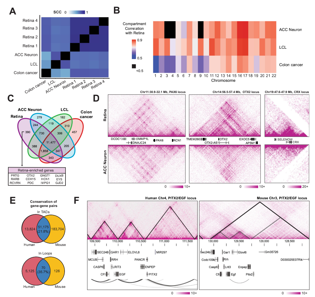 為了評估已識別的染色質(zhì)特征在人視網(wǎng)膜組織特異性和物種保守性,這里比較了人類神經(jīng)元(ACC)、GM12878淋巴細(xì)胞(LCL)、結(jié)腸癌細(xì)胞(HCT116,clone cancer)Hi-C測序數(shù)據(jù),發(fā)現(xiàn)視網(wǎng)膜特異性基因,如OTX2、EYS、PDC,只存在于視網(wǎng)膜的A component;由于視網(wǎng)膜和ACC神經(jīng)元之間的高度相關(guān)性,比較發(fā)現(xiàn)PAX6基因座在神經(jīng)元和視網(wǎng)膜中的相互作用與其在兩個組織中的表達(dá)相似,而編碼OTX2和CRX兩個關(guān)鍵的視網(wǎng)膜TF,在視網(wǎng)膜中表現(xiàn)出大量的局部相互作用,但在神經(jīng)元中沒有,表明人視網(wǎng)膜組織拓?fù)潢P(guān)聯(lián)域具有組織特異性,并在基因調(diào)節(jié)中發(fā)揮著重要作用。
