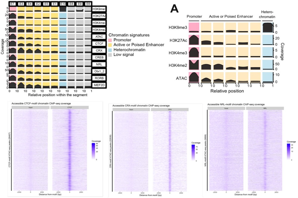 染色質(zhì)互作形成的loops促進(jìn)CRE與其目標(biāo)基因之間的物理相互作用,并且在控制基因表達(dá)方面發(fā)揮著至關(guān)重要的作用。為了識別視網(wǎng)膜CRE,利用染色質(zhì)可及性檢測(ATAC-seq)確定了染色質(zhì)開放狀態(tài)和CUT&Run檢測活性(H3K4me3,H3K27Ac,H3K4me234)和抑制性(H3K9me3)組蛋白標(biāo)記互作的特征序列。通過全基因組染色質(zhì)開放程度以及開放區(qū)域(啟動子、增強(qiáng)子、異染色質(zhì)、低豐度信號)構(gòu)建了10種染色質(zhì)狀態(tài)模型,啟動子和增強(qiáng)子區(qū)域富集了用于結(jié)合CTCF和關(guān)鍵視網(wǎng)膜TF,如CRX、NRL、OTX2、MEF2D、CREB和RORB,另外增強(qiáng)子主要在TSS上游區(qū)域富集,而啟動子僅在TSS富集。