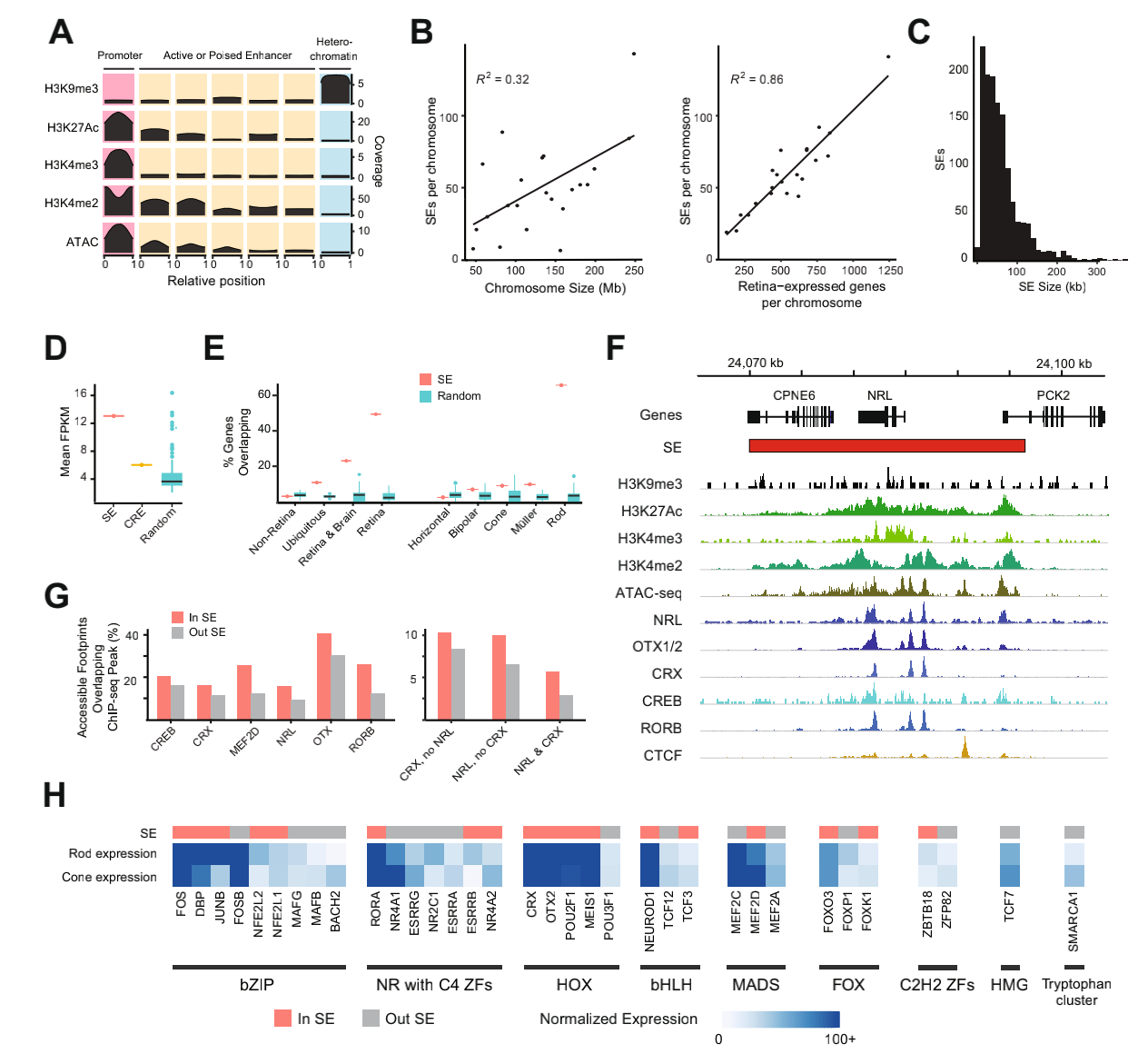 利用H3K27Ac蛋白標(biāo)記互作在視網(wǎng)膜順式調(diào)控元件啟動子和活性或穩(wěn)定增強(qiáng)子區(qū)域鑒定了1325個超級增強(qiáng)子(SEs),發(fā)現(xiàn)視網(wǎng)膜表達(dá)基因的數(shù)量與每個染色體的SE數(shù)量之間存在高度相關(guān)性。SE與轉(zhuǎn)錄組測序數(shù)據(jù)集結(jié)合分析表明,與CRE相比,SE重疊的基因的平均表達(dá)量高2.17倍,并且比100組隨機(jī)SE大小的位點(diǎn)高2.89倍,視網(wǎng)膜中關(guān)鍵的光感受器特異性基因NRL主要在活性組蛋白標(biāo)記和染色質(zhì)開放區(qū)域的大型SE中富集,與CRE或隨機(jī)區(qū)域相比,TF結(jié)合位點(diǎn)主要存在于SE中,其中編碼許多具有豐富結(jié)合基序TF的基因也與SE重疊,這表明它們在維持視網(wǎng)膜穩(wěn)態(tài)方面的潛在作用。