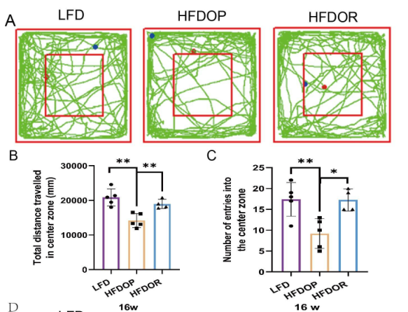為了排除抑郁和焦慮樣行為對(duì)肥胖抵抗的影響,在16周結(jié)束時(shí)進(jìn)行了自發(fā)開場(chǎng)活動(dòng)實(shí)驗(yàn)和高架十字迷宮實(shí)驗(yàn)。開場(chǎng)實(shí)驗(yàn)結(jié)果如圖2A-C所示。HFDOP組進(jìn)入中心區(qū)域的次數(shù)和進(jìn)入該區(qū)域的次數(shù)顯著低于LFD組(圖2B、C)。HFDOR 組比 HFDOP 組更遠(yuǎn)地進(jìn)入中心區(qū)域并且更頻繁地進(jìn)入該區(qū)域(圖2B、C)。高架十字迷宮實(shí)驗(yàn)表明,與LFD組相比,HFDOP組進(jìn)入開臂的次數(shù)和頻率都要少得多(圖3E、F)。HFDOR組比HFDOP組開臂走得更遠(yuǎn),但兩組之間沒有統(tǒng)計(jì)學(xué)意義。HFDOR組比HFDOP組更頻繁地進(jìn)入開臂(圖3F)。