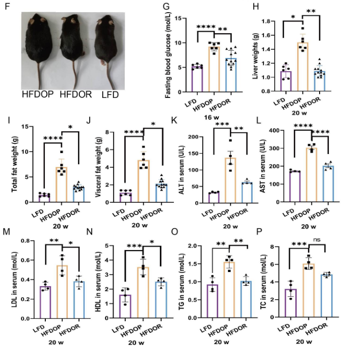 然而,HFDOR組的肝臟、總脂肪和總內(nèi)臟脂肪的重量顯著低于HFDOP組(圖1H-J)。HFDOP組AST、ALT、HDL、LDL、TG和TC水平較LFD組顯著升高(圖3K-P)。然而,HFDOR組的AST、ALT、高密度脂蛋白、低密度脂蛋白和甘油三酯水平顯著低于HFDOP組(圖3K-O)。盡管HFDOR組的TC水平低于HFDOP組,但差異無統(tǒng)計(jì)學(xué)意義。