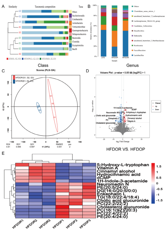 使用全長(zhǎng)16S微生物多樣性測(cè)序和非靶向代謝組學(xué)方法檢測(cè)了小腸內(nèi)容物。HFDOP組的Muribaculaceae、Faecalibaculum、Desulfovibrio和 Lachnospiraceae的相對(duì)豐度高于 LFD 和 HFDOR 組,但差異無統(tǒng)計(jì)學(xué)意義。LFD對(duì)照組和HFDOR組Clostridium和Lactobacillus的相對(duì)豐度高于 HFDOP 組,但只有梭狀芽胞桿菌水平的差異具有統(tǒng)計(jì)學(xué)意義。