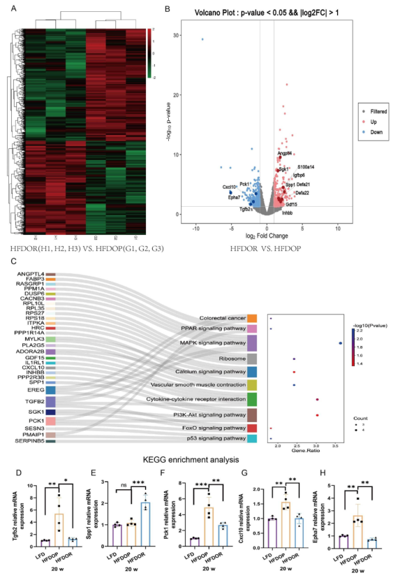 為了進(jìn)一步探討肥胖/肥胖抵抗的原因,研究者運(yùn)用全長(zhǎng)轉(zhuǎn)錄組測(cè)序技術(shù)檢測(cè)空腸組織中的基因轉(zhuǎn)錄水平。共鑒定出1645個(gè)差異表達(dá)基因(750個(gè)上調(diào),895個(gè)下調(diào)),其中331個(gè)差異表達(dá)顯著。在331個(gè)顯著差異表達(dá)基因中中,有30個(gè)基因在11條KEGG通路中被富集。富集的基因和10條最豐富的KEGG途徑如圖所示,這些基因在絲裂原活化蛋白激酶(MAPK)、細(xì)胞因子和磷脂酰肌醇3’激酶/蛋白激酶B(PI3K/Akt)信號(hào)通路中顯著豐富(圖6C)。用qPCR分別驗(yàn)證了差異表達(dá)基因。Tgfb2、Spp1、Pck 1、Cxcl10和Epha7表現(xiàn)出一致的mRNA表達(dá)模式(圖6B,D-H)。