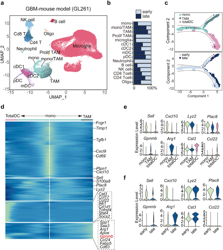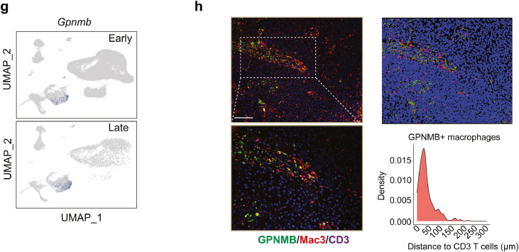 收集小鼠GBM scRNA-seq數(shù)據(jù),重點關注在早期(d7)和晚期(d28)GBM小鼠的CD45 +免疫細胞。根據(jù)細胞maker基因表達鑒定到了NK cells、Cd8+ T cells、Cd4+ T cells、 B cells、neutrophils、cDC1、cDC2、pDC、mDC、monocytes、TAM、monocytes/TAM、microglia cells(圖5a);與以往的報道類似,巨噬細胞隨著腫瘤進展急劇侵入腫瘤部位,而小膠質(zhì)細胞在腫瘤發(fā)展過程中逐漸消失(圖5b);細胞軌跡分析推斷出樹突狀細胞和巨噬細胞起源于單核細胞,并隨著腫瘤進展而逐漸分化(圖5c);不同的通路主導了腫瘤浸潤T細胞的募集,單核細胞主要表達Cxcl10、Cxcl9、樹突狀細胞特異性表達Ccl17、Ccl22,而巨噬細胞表達Ccl24,Saa3、Arg1和Gpnmb僅在巨噬細胞中出現(xiàn)(圖5d);在腫瘤發(fā)生過程中,Arg1和Gpnmb的表達在巨噬細胞中被強烈誘導(圖5e-g),這與人GBM數(shù)據(jù)集中的發(fā)現(xiàn)一致;然而,Gpnmb敲低后CD206(經(jīng)典M2巨噬細胞標志物)表達不變,提示GPNMB不是M2巨噬細胞極化的驅(qū)動因素;免疫熒光染色顯示GPNMB+巨噬細胞與T細胞共定位(圖5h),表明它們之間存在潛在的相互作用。