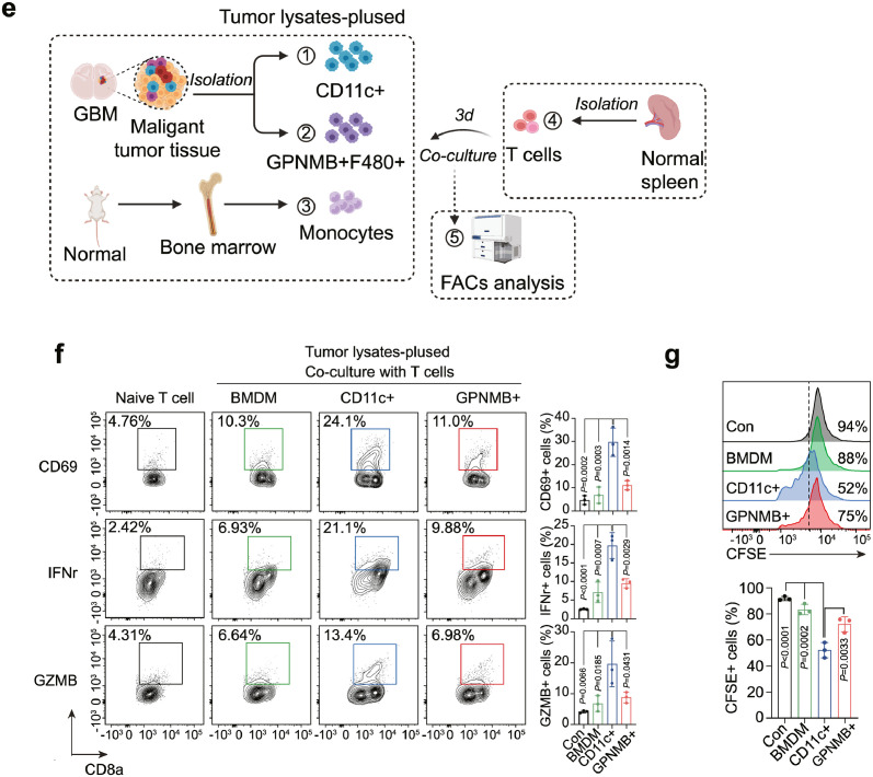 利用CytoTalk算法分析GBM中T細胞與APC-like細胞間的相互作用,研究完整的信號轉(zhuǎn)導途徑,結(jié)果顯示,T細胞通過Chemokines、cytokines、co-stimulatory/inhibitory、antigen-presentation通路與單核細胞、Gpnmb-high巨噬細胞、樹突狀細胞相互作用,并且DC細胞與Gpnmb-high巨噬細胞共享Cxcl16-Cxcr6趨化因子信號與T細胞相互作用。為了驗證Gpnmb-high巨噬細胞的調(diào)控機制,從GBM腫瘤和正常小鼠中提取F4/80 + GPNMB +巨噬細胞、D11c + DC和骨髓來源的單核細胞,然后與na?ve T細胞共培養(yǎng)(圖6e);實驗結(jié)果顯示,與GPNMB+巨噬細胞和單核細胞相比,CD11c + DC共培養(yǎng)表達更高水平的CD69、IFNγ和GZMB,能更好地誘導T細胞活化(圖6f);T細胞增殖實驗檢測結(jié)果也表明,與GPNMB+巨噬細胞和單核細胞相比,CD11c + DC能顯著促進T細胞增殖(圖6g)。綜合以上結(jié)果,確定了關鍵的GPNMB-high巨噬細胞亞群是GBM細胞間通訊的樞紐,不僅誘導PN-MES腫瘤細胞轉(zhuǎn)化,而且通過與DC競爭而損害T細胞激活。Tips:利用細胞通訊分析篩選潛在細胞間互作的受體-配體對,結(jié)合細胞共培養(yǎng)、co-IP和免疫熒光等實驗,可以探究目標細胞類型對特定細胞功能的影響及機制。