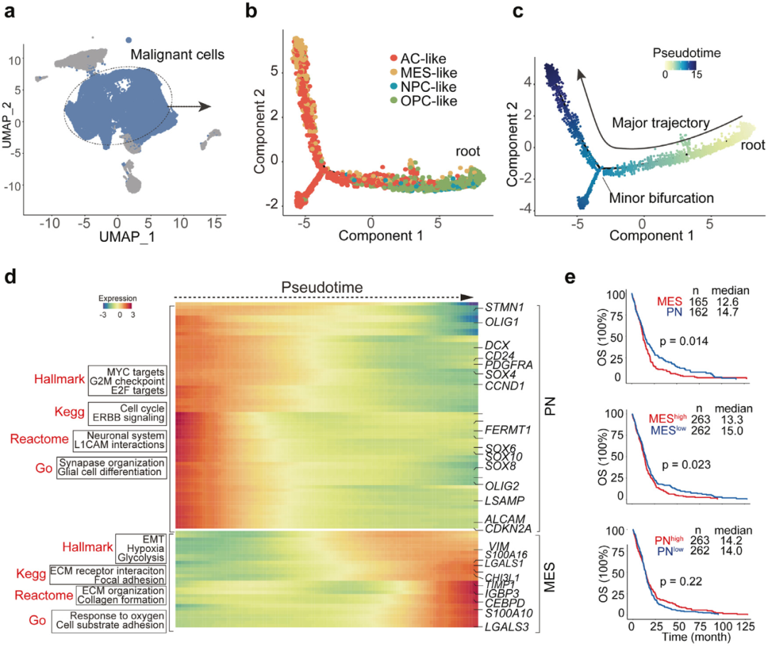利用細胞軌跡分析,探索GBM不同腫瘤亞型間的分化關系,結(jié)果顯示擬時間線上主要由NPC-和OPC-like 腫瘤細胞逐漸分化為AC-和MES-like腫瘤細胞,同時有個小分支為AC-like腫瘤細胞,揭示了GBM的可塑性和前神經(jīng)元型(proneural, PN)到間質(zhì)型(mesenchymal, MES)的動態(tài)過渡(圖2a-c);PN與細胞周期、G2M檢查點和神經(jīng)膠質(zhì)細胞分化相關的通路顯著富集,表明PN具有高度增殖性和可塑性,而MES與上皮-間充質(zhì)轉(zhuǎn)化(EMT)、缺氧、ECM組織和細胞粘附相關的通路顯著富集(圖2d);利用TCGA數(shù)據(jù)集進行生存分析,結(jié)果顯示,與PN組相比,具有MES-like轉(zhuǎn)錄組特征的患者總生存期較差,而與MES-low組相比,MES-high組預后更差,表明具有間充質(zhì)特征的GBM患者的生存結(jié)局較差(圖2e)。Tips:利用TCGA數(shù)據(jù)庫中的臨床數(shù)據(jù),將單細胞數(shù)據(jù)中鑒定到關鍵maker基因或基因集進行生存分析,是探討臨床意義的有效途徑。