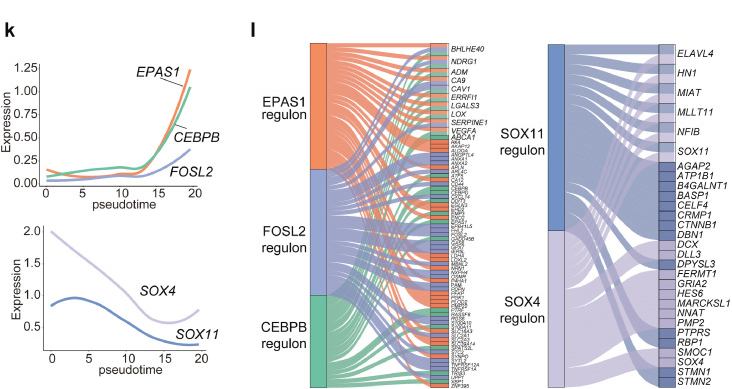 利用SCENIC分析PN或MES細胞中的關鍵轉(zhuǎn)錄調(diào)控網(wǎng)絡,結(jié)果顯示,轉(zhuǎn)錄因子E2F1、SOX9、RARA、SOX11和SOX4在OPC和NPC細胞中差異過表達,而 EAPS1、CEBPB、FOSL2、STAT2和EGR1在MES和AC細胞狀態(tài)中差異過表達,細胞軌跡分析證實了PN-MES轉(zhuǎn)換過程中EPAS1、CEBPB和FOSL2的激活以及SOX4、SOX11的下調(diào)(圖2k)。以上結(jié)果突出了從PN到MES細胞狀態(tài)的動態(tài)轉(zhuǎn)變主要是由關鍵轉(zhuǎn)錄因子驅(qū)動的。
