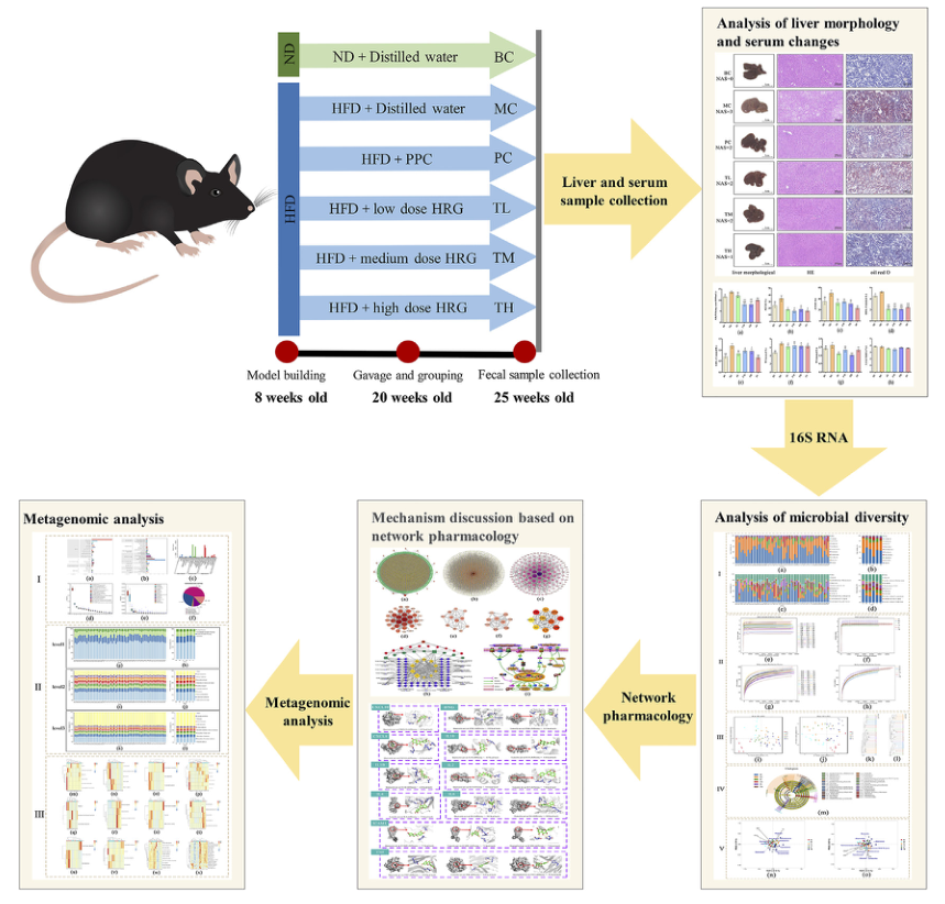 綜上所述,HRG可能通過改變微生物多樣性、結(jié)構(gòu)和功能來改善高脂飲食誘導(dǎo)的NAFL。還有可能通過調(diào)節(jié)腸道相關(guān)的代謝途徑、炎癥反應(yīng)和免疫反應(yīng)來改善NAFL相關(guān)的脂肪堆積和肝臟損傷。這些結(jié)果有力地表明,HRG可能通過預(yù)防腸道菌群失調(diào)來減輕NAFL。此外,HRG可通過腸道菌群治療多種成分、多代謝途徑、多靶點的NAFL。本研究為NAFL的治療提供了新的思路,證實了腸道菌群與NAFL之間的關(guān)系,提示HRG具有良好的治療效果。
