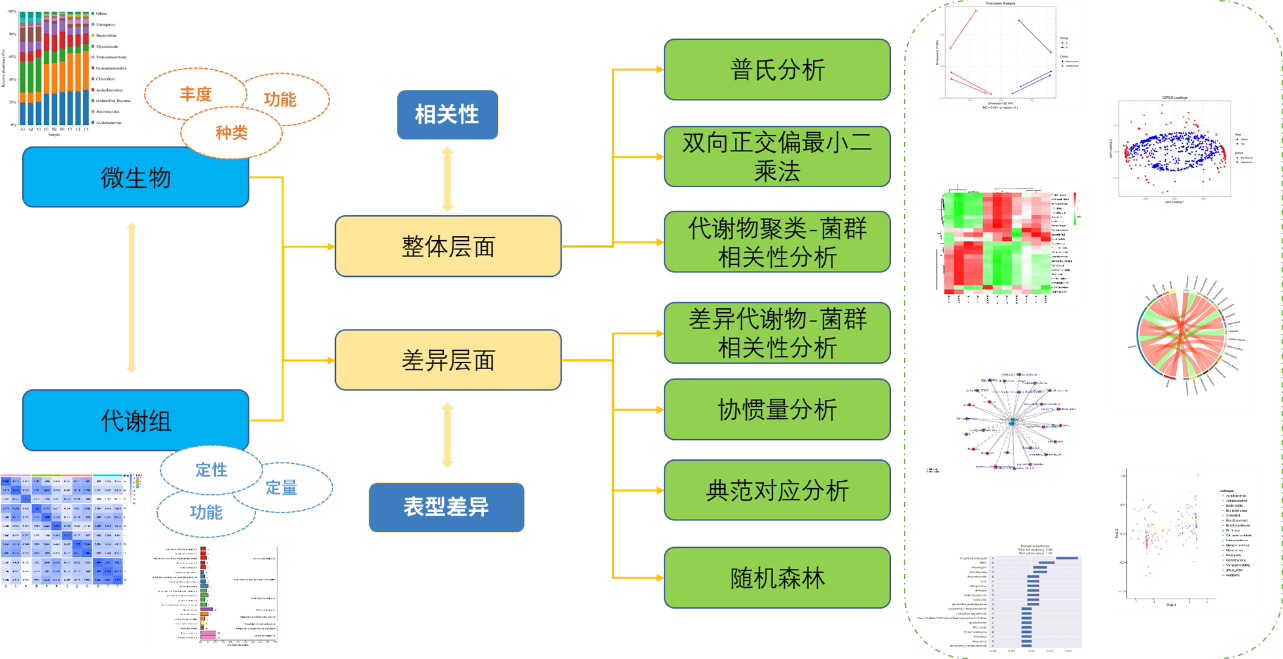 微生物和代謝組聯(lián)合分析從兩個(gè)層面去進(jìn)行聯(lián)合,整體層面去展示微生物和代謝物之間的整體相關(guān)性,比如普氏分析、代謝物聚類-菌群相關(guān)性分析;從差異層面則基于不同的差異處理組,去進(jìn)一步聯(lián)系表型關(guān)系,看具體的微生物和代謝之間的關(guān)系是否與生物的表型差異相關(guān),這里則主要有差異代謝物和菌群相關(guān)性分析、協(xié)慣量分析、典范對(duì)應(yīng)分析、隨機(jī)森林分析等,接下來(lái)我們就這些分析和大家具體看下怎么解讀和應(yīng)用。