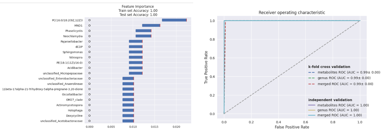 右圖注:虛線顯示訓(xùn)練集K重交叉驗(yàn)證的平均ROC曲線,實(shí)線顯示獨(dú)立驗(yàn)證的ROC曲線。不同顏色虛線和實(shí)線分別表示代謝組、微生物組(屬水平)分別建模以及合并建模的ROC曲線。