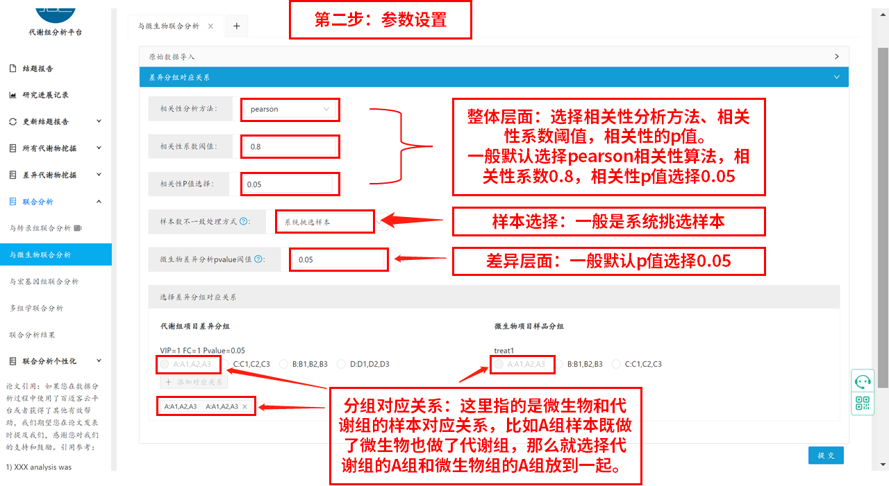 第二步參數(shù)設(shè)置:整體層面選擇相關(guān)性分析方法、相關(guān)性系數(shù)閾值,相關(guān)性的p值。一般默認(rèn)選擇pearson相關(guān)性算法,相關(guān)性系數(shù)0.8,相關(guān)性p值選擇0.05。分組對(duì)應(yīng)關(guān)系:這里指的是微生物和代謝組的樣本對(duì)應(yīng)關(guān)系,比如A組樣本既做了微生物也做了代謝組,那么就選擇代謝組的A組和微生物組的A組放到一起,具體示例圖如下: