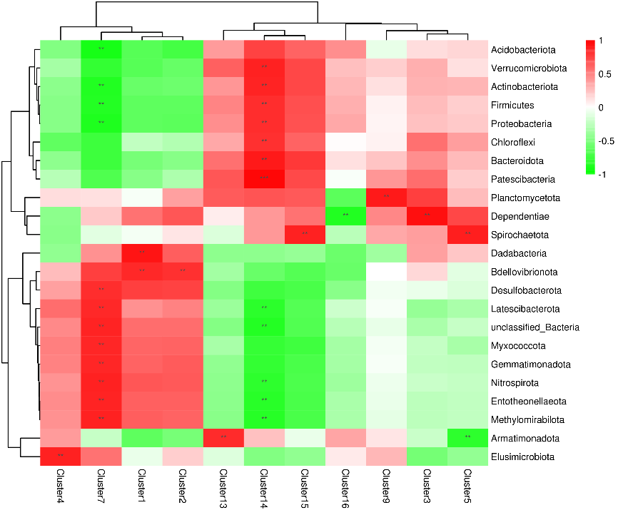 注:圖右側(cè)為微生物(門水平),下方為代謝物簇,左側(cè)和上方分別為微生物和代謝物簇的聚類樹狀圖。不同顏色代表皮爾遜相關(guān)系數(shù)的大小,絕對(duì)值越接近于 1,相關(guān)性越高。紅色表示正相關(guān),而綠色表示負(fù)相關(guān)。星號(hào)表示代謝物簇和微生物之間顯著性相關(guān)(p<0.05),*、**和***表示相關(guān)性顯著程度依次增強(qiáng),分別表示 p<0.05,p<0.01和 p<0.001.