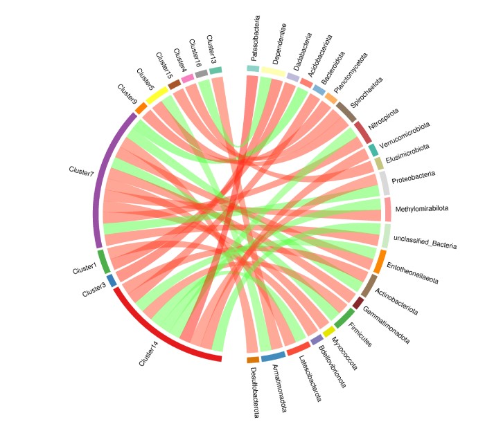 (2)代謝物簇-微生物和弦圖:將top30 頻數(shù)的代謝物簇/微生物的相關(guān)性結(jié)果表,保留至少含一組相關(guān)性系數(shù)絕對(duì)值在Top 30(按照相關(guān)系數(shù)絕對(duì)值從大到小排序)內(nèi)的數(shù)據(jù) ,用于相關(guān)性弦圖的繪制。