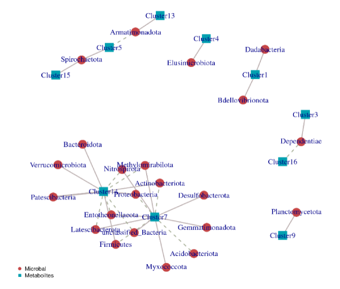注: 圖中代謝物簇用藍(lán)色方形標(biāo)出,微生物用紅色圓形標(biāo)出。實(shí)線代表正相關(guān),虛線代表負(fù)相關(guān)。