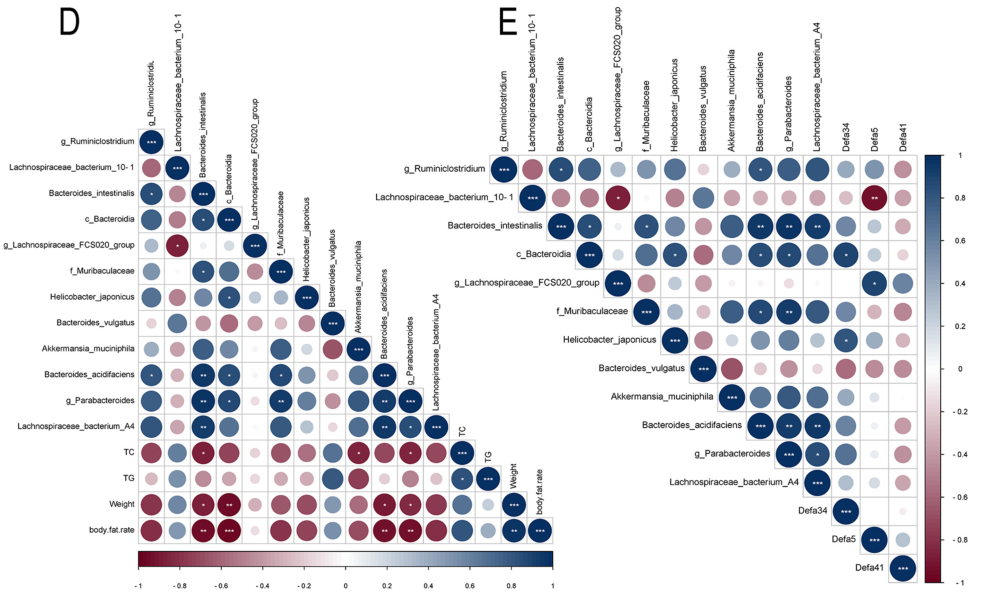 EA促進(jìn)了腸粘膜免疫中3個代表性基因Defa5、Defa20和Defa41的表達(dá),其中Defa5顯著上調(diào)(圖6A);EA還恢復(fù)了這些防御素的蛋白質(zhì)水平,其中Defa5和Defa41顯著增加(圖6B)。斯皮爾曼相關(guān)系數(shù)分析結(jié)果顯示,Defa5和Defa34的蛋白質(zhì)水平與關(guān)鍵肥胖指數(shù)呈負(fù)相關(guān),包括體重、體脂百分比以及甘油三酯TG、總膽固醇TC含量(圖6C);,EA下調(diào) Lachnospiraceae bacterium_10_1和 Bacteroides acidifaciens物種的相對豐度,與肥胖小鼠的關(guān)鍵肥胖指數(shù)呈正相關(guān)(圖6D);EA調(diào)節(jié)的腸道防御素表達(dá)與幾種腸道菌群相關(guān)(圖6E)。以上結(jié)果表明,腸道防御素的調(diào)節(jié)是EA拯救肥胖小鼠腸道微生物群的關(guān)鍵機(jī)制之一。
