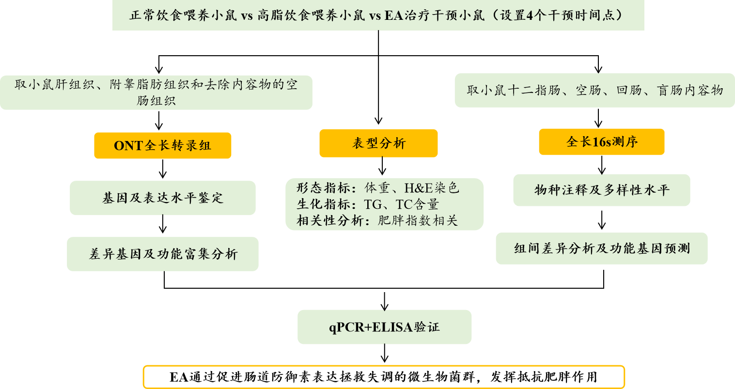 肥胖作為一種不斷增長的非傳染性流行病,影響了超過20億人。腸道微生物菌群失調(diào)已被證明是肥胖和肥胖相關(guān)疾病發(fā)生和進(jìn)展的關(guān)鍵因素,包括高血壓、II型糖尿病、血脂異常和非酒精性脂肪性肝病(NAFLD)。針灸已被廣泛用于治療肥胖癥,研究報道,電針(EA)可以減輕肥胖小鼠的體重,挽救生態(tài)失調(diào)的腸道微生物群,還可以調(diào)節(jié)免疫力。然而,EAEA重塑腸道微生物群的潛在機(jī)制尚不清楚,如何通過腸道微生物菌群調(diào)節(jié)腸道先天免疫力對抗肥胖仍有待闡明。