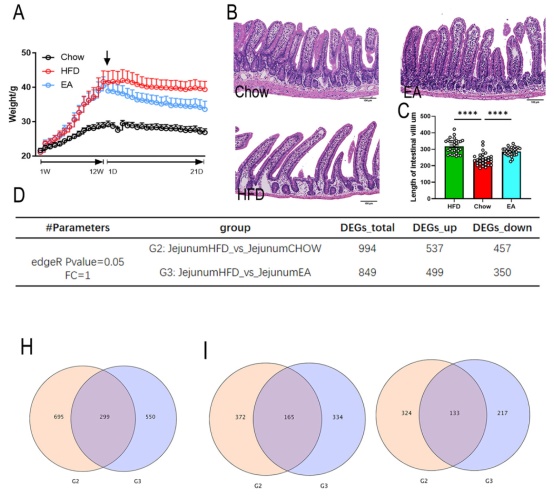 相較于HFD組,EA組顯示出顯著地減肥效果(圖2A),并減少了附睪、腎臟和腹股溝區(qū)域的脂肪堆積。空腸是腸道脂質(zhì)消化和吸收的主要區(qū)域,HFD小鼠的空腸絨毛明顯長于食物組(圖2B, 2C)。HFD組和正常對照組間共鑒定出994個差異表達(dá)基因DEG(圖2D-F),HFD組和EA組共鑒定出849個DEG(圖2G);通過取兩個比較組共有的DEG,作為EA直接調(diào)控肥胖的DEG,共檢測到共有基因299個,其中上調(diào)的有165個,下調(diào)的有133個(圖2H-J)。