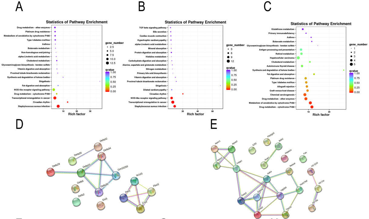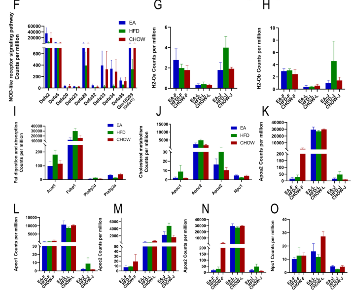 對共有DEG進(jìn)行功能富集分析,發(fā)現(xiàn)顯著富集的通路主要與宿主先天防御和脂質(zhì)代謝相關(guān)(圖3A);在去除功能未鑒定的基因或lncRNA后,獲得140個上調(diào)和92個下調(diào)的DEG也進(jìn)行功能富集分析(圖3B, 3C);然后,對top20通路的DEG進(jìn)行PPI調(diào)控網(wǎng)絡(luò)分析(圖3 D, 3E),結(jié)果顯示,EA主要上調(diào)的通路包括α防御素基因在內(nèi)的NOD樣受體信號通路(圖3 D),下調(diào)的通路脂質(zhì)代謝(包括脂質(zhì)消化和吸收途徑),以及免疫應(yīng)答相關(guān)通路(谷胱甘肽s-轉(zhuǎn)移酶和MHC II類相關(guān)基因)(圖3E)?;虮磉_(dá)直方圖顯示EA干預(yù)恢復(fù)大量異常表達(dá)的DEG,與腸粘膜免疫相關(guān)的DEG,如α防御素基因,可以通過EA顯著恢復(fù)(圖3F);與免疫反應(yīng)相關(guān)的H2-Ob和H2-OA僅在空腸區(qū)域下調(diào)(圖3G, 3H);EA干預(yù)恢復(fù)了fabp1、pla2g2d和acat1的表達(dá)水平,主要負(fù)責(zé)脂肪消化和吸收(圖3I);最后,EA干預(yù)通過下調(diào)apoc1、apoa2和apoc2以及上調(diào)npc1來調(diào)節(jié)膽固醇代謝(圖3J-O)。