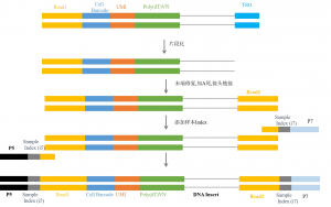 接下來進入單細胞測序的第三環(huán)節(jié)–文庫構(gòu)建。文庫構(gòu)建可分為三個部分:DNA片段化/末端修復(fù)/添加A尾、接頭連接和Index PCR(PCR富集)。