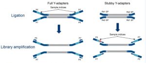 隨后對修復(fù)后的片段進行接頭連接,主要是利用DNA連接酶,將3’端帶有dA的DNA片段與adapter接頭進行連接。接頭的分類有兩種方式: