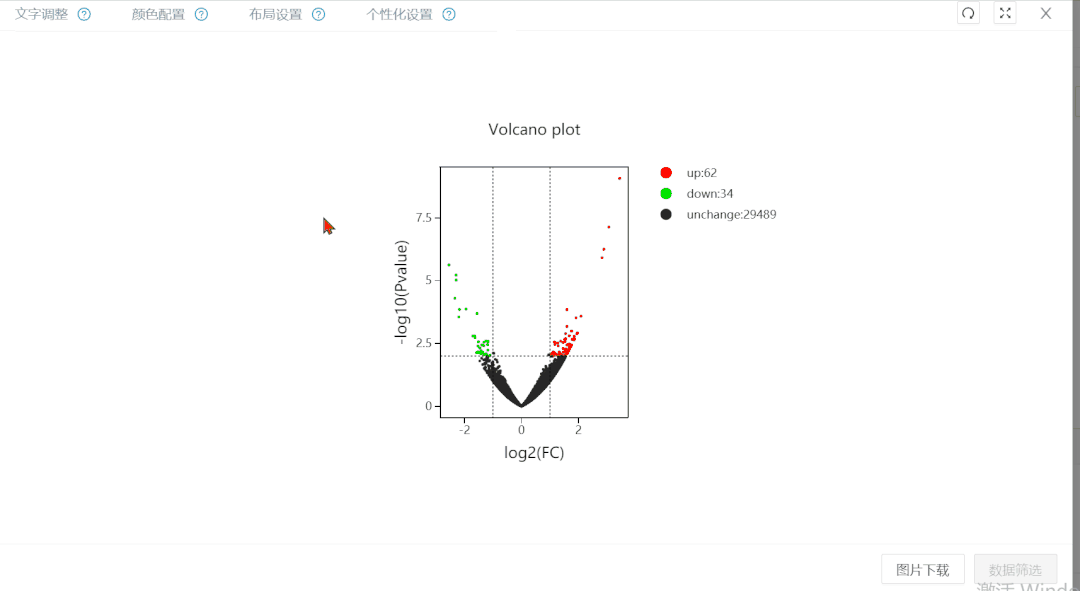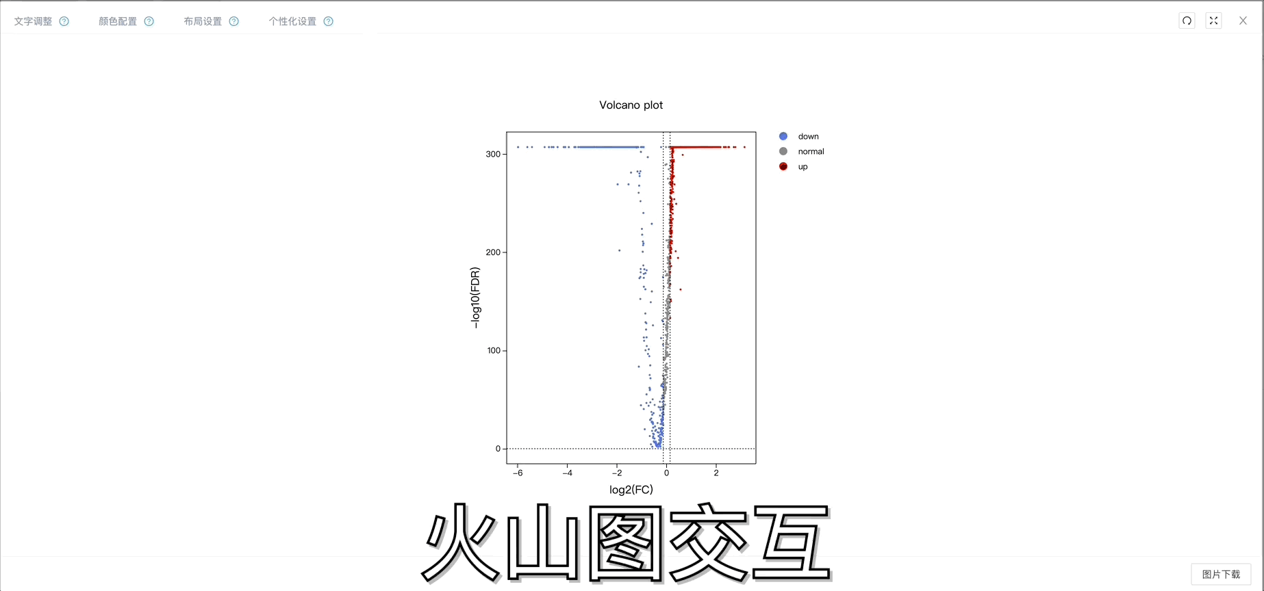 火山圖(Volcano Plot)可以快速地查看基因/物質(zhì)在兩個(組)樣品中表達(dá)水平的差異?;鹕綀D的交互式支持自定義展示一定數(shù)目的重點差異基因,還支持支持選擇重點差異基因進(jìn)行數(shù)據(jù)篩選,進(jìn)行二次數(shù)據(jù)處理。