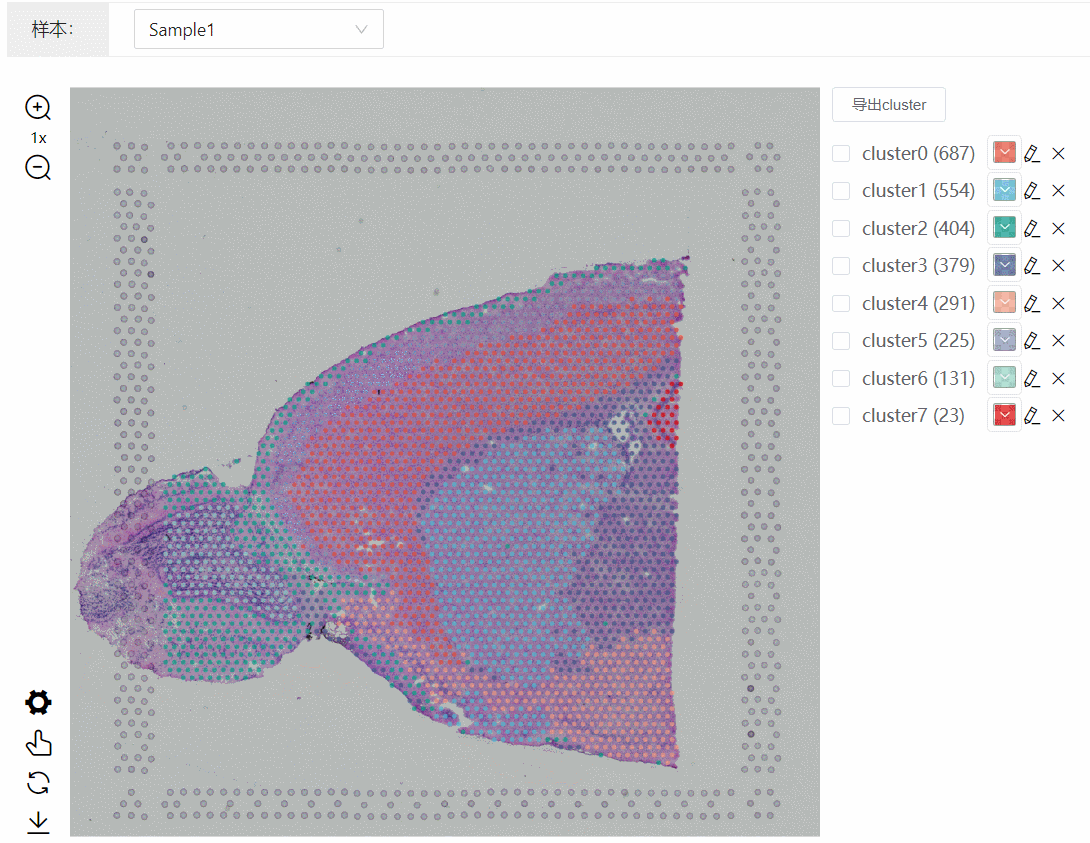 空間轉(zhuǎn)錄組的客戶,可根據(jù)組織聚類圖,結(jié)合影像學(xué)和研究目的,自主選擇感興趣區(qū)域(ROI,region of interesting),查看區(qū)域之間的基因表達(dá)情況,從而獲得更典型的對比結(jié)果。