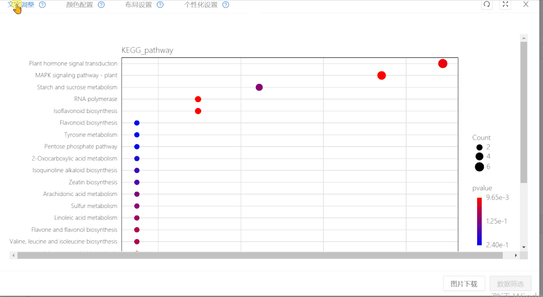 氣泡圖是富集分析后的重要展示手段,交互氣泡圖常用于GO和KEGG氣泡圖,支持Pvalue/Qvalue以及rich_factor/GeneRatio的自由切換,支持圖片選擇重點富集通路進(jìn)行數(shù)據(jù)篩選,進(jìn)行二次數(shù)據(jù)處理。